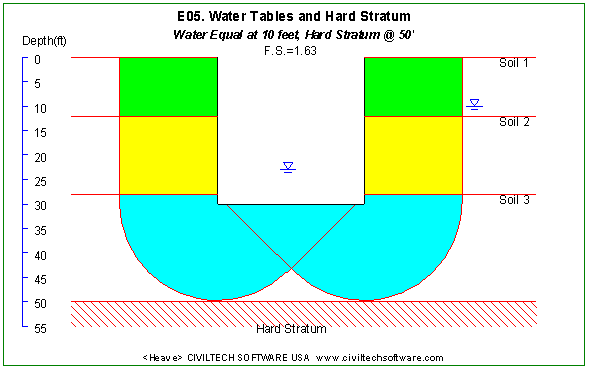 Heave uses Terzaghi’s method. The factor of safety will be calculated and the failure surface will be presented graphically. This program is also included in Shoring Suite.